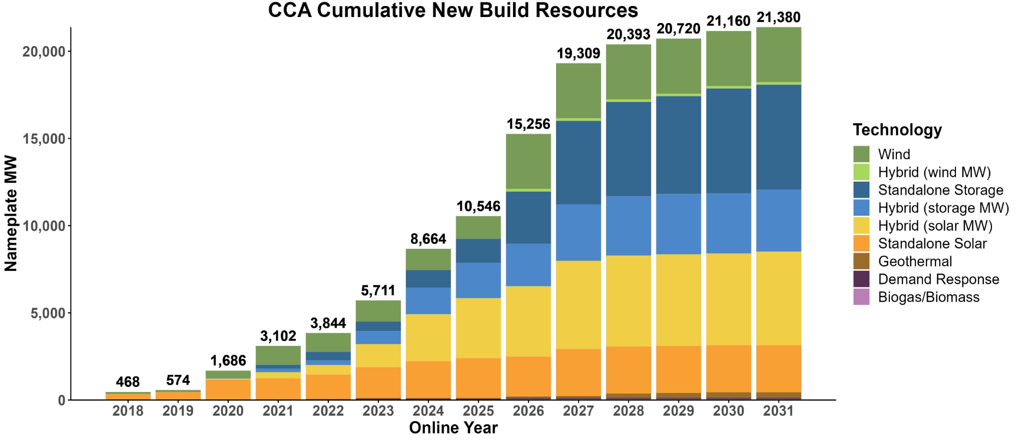 Community choice energy providers have now secured 389 long-term PPAs, totaling 21,380 MW of new-build clean energy, including over 11,500 MW of renewable energy and more than 9,600 MW of energy storage. CCAs added over 3,000 MW of new contracts in just the last year.